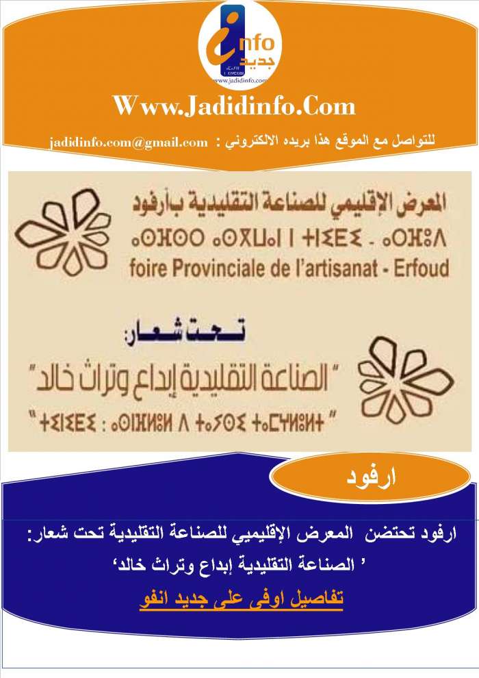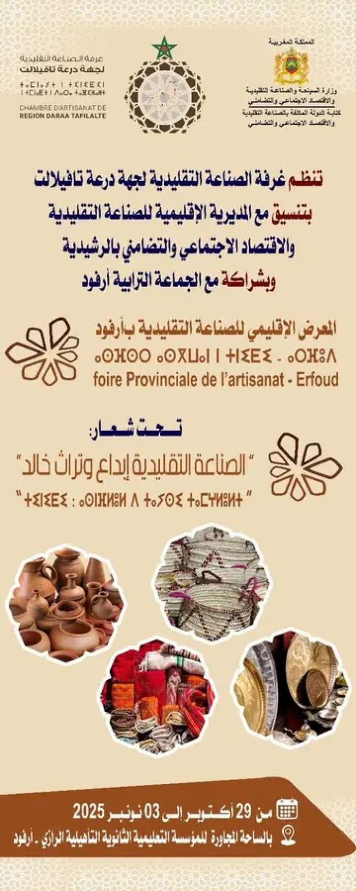في إطار فعاليات الملتقى الدولي للتمر ، تحتضن مدينة أرفود من 29 أكتوبر إلى 2 نونبر 2025، فعاليات المعرض الإقليمي للصناعة التقليدية، الذي تنظمه غرفة الصناعة التقليدية لجهة درعة تافيلالت، بتنسيق مع المديرية الإقليمية للصناعة التقليدية والاقتصاد التضامني والاجتماعي بالرشيدية، وبشراكة مع الجماعة الترابية لأرفود، تحت شعار: "الصناعة التقليدية... إبداع وتراث خالد".