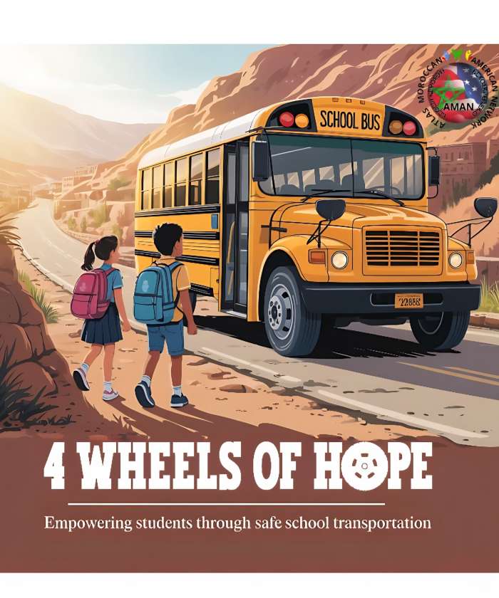 أطلقت جمعية أطلس أمان المغربية الأمريكية بولاية بنسلفانيا بالولايات المتحدة الأمريكية مبادرة إنسانية تربوية متميزة أطلق عليها(04 عجلات للأمل) 4 WHEELS OF HOPE تروم محاربة الهدر المدرسي بالمملكة المغربية بعدد من المناطق وخاصة بالجنوب الشرقي، من أجل تغطية رسوم النقل المدرسي لعدد من التلاميذ المعوزين المنتمين إلى أوساط اجتماعية هشة وبالأخص المتمدرسين اليتامى وذوي الاحتياجات الخاصة وبتنسيق مع جمعية الواحة للصورة بحوض دادس .
