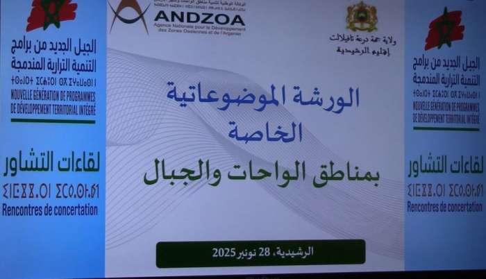 عقدت الوكالة الوطنية الوطنية لتنمية مناطق الواحات وشجرالاركان االيوم الجمعة 28 نونبر الجاري بقاعة الاجتماعات بولاية درعة تافيلالت، لقاء موضوعاتيا خاصا بمناطق الواحات والجبال لاستجماع مقترحات تنموية مندمجة تتعلق بالواحات والجبال التي تشغل مساحات كبيرة بجهة درعة تافيلالت، قصد تدارسها من اجل انطلاقة نوعية لبرامج الجيل الجديد من التنمية .