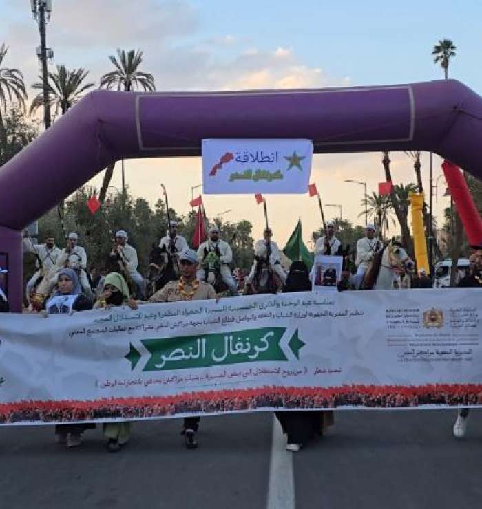والذي انطلق من ملعب الحارثي محاذاة المديرية الجهوية ليجوب شوارع مدينة مراكش ليصل الى ساحة مسجد الكتبية حيث الحفل الفني الكبير واللوحات الاستعراضية والأغاني الوطنية ومعرض المنتوجات النسوية..