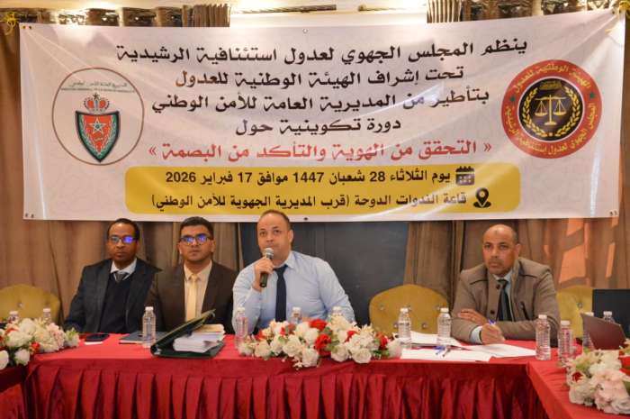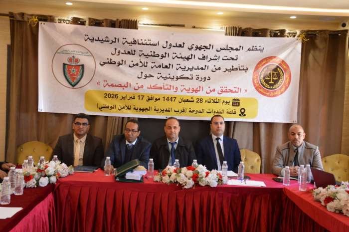 في سياق الجهود الرامية إلى تحديث الإدارة وتجويد خدماتها، احتضنت قاعة الدوحة بالرشيدية يوم الثلاثاء 17 فبراير الجاري دورة تكوينية متخصصة حول 'التحقق من الهوية والتأكد من البصمة 'من تنظيم المجلس الجهوي لعدول استئنافية الرشيدية بتأطير من المديرية العامة للامن الوطني، لفائدة العدول وأطر وموظفين معنيين بتدبير مساطر التعريف والتوثيق، وذلك بهدف الرفع من كفاءتهم المهنية وتعزيز قدراتهم التقنية والقانونية في هذا المجال الحيوي.