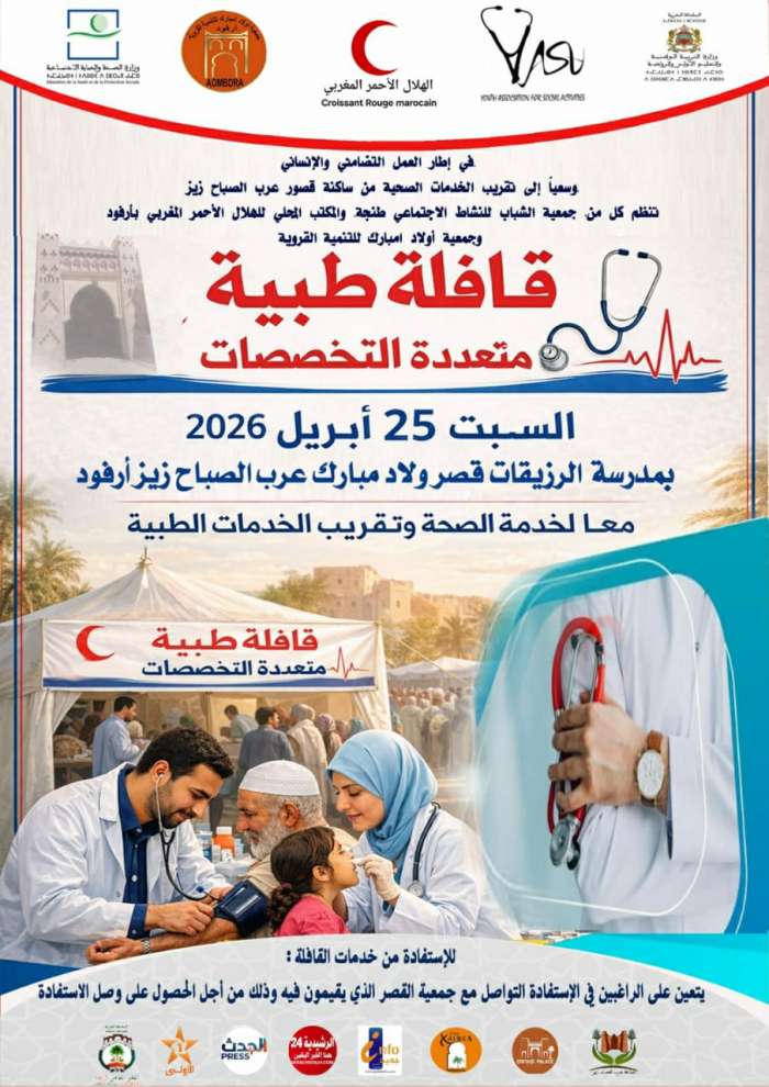 في إطار العمل التضامني والإنساني ،وسعيا لتقريب الخدمات الصحية من قصور ساكنة عرب الصباح زيز ،تنظم كل من جمعية الشباب للنشاط الاجتماعي طنجة، والمكتب المحلي للهلال الاحمر المغربي بارفود، وجمعية اولاد مبارك للتنمية القروية، ينظمون قافلة طبية متعددة التخصصات، وذلك يوم السبت 25ابريل الجاري بمدرسة الرزيقات قصر اولاد امبارك عرب الصباح زيز بارفود.